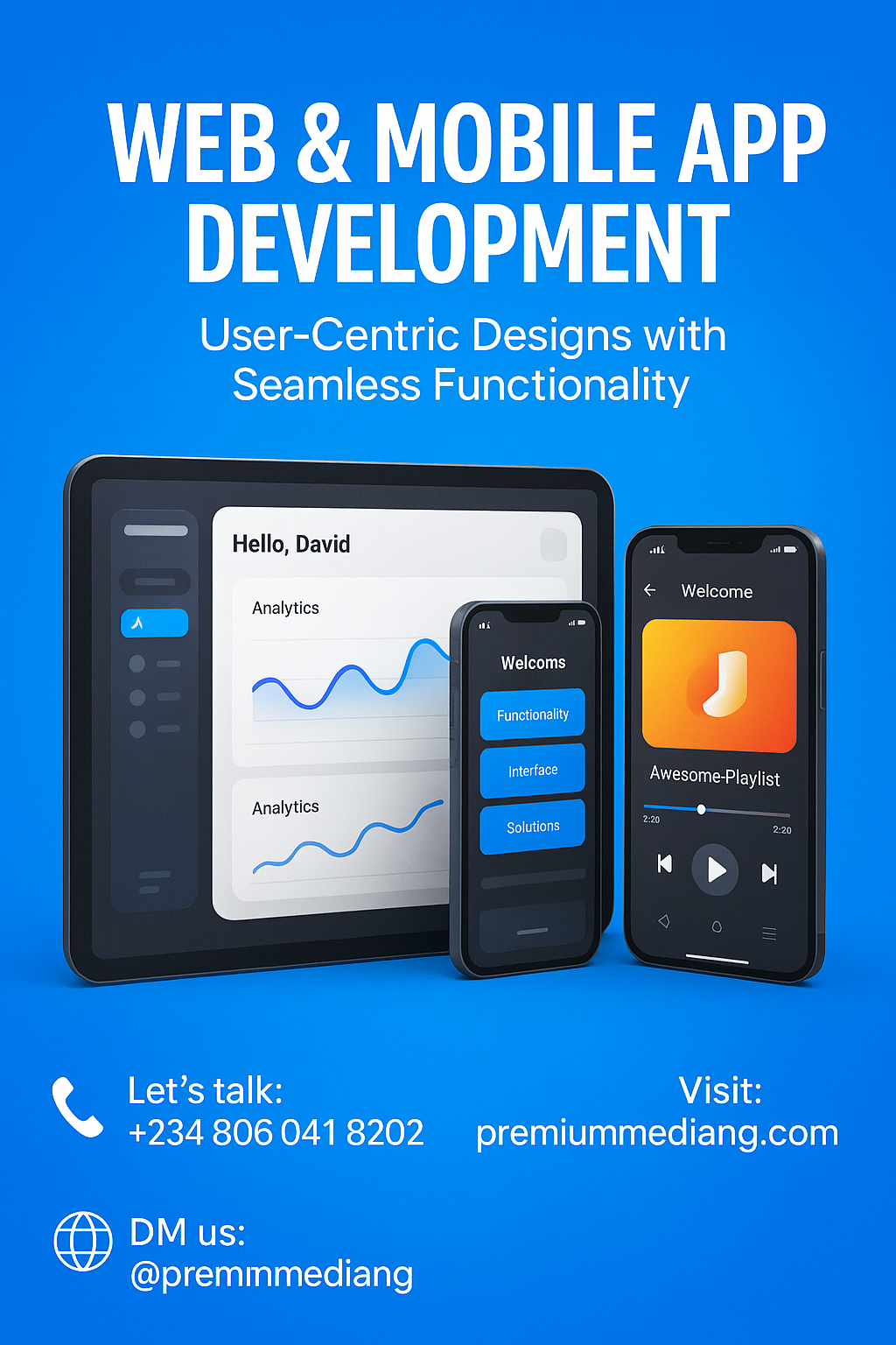 At Premium Media NG, we specialize in web and mobile app development that blends user‑centric design with seamless functionality, ensuring your product not only looks stunning but also delights users at every tap and click.